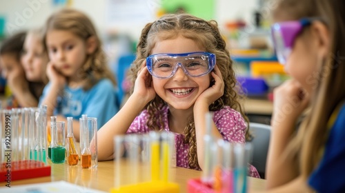 bright, airy, classroom, filled, elementary, student, engaged, science, experiment, test, tube, beaker, safety, goggles, guidance, enthusiastic, teacher, capturing, excitement, discovery, exploration, joy, learning, through, practical, experience