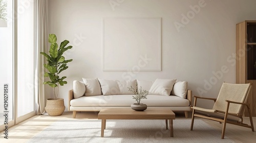 A bright and airy living room featuring minimalist design with light colored sofa, wooden chair, and potted plant. natural light enhances serene atmosphere, perfect for relaxation