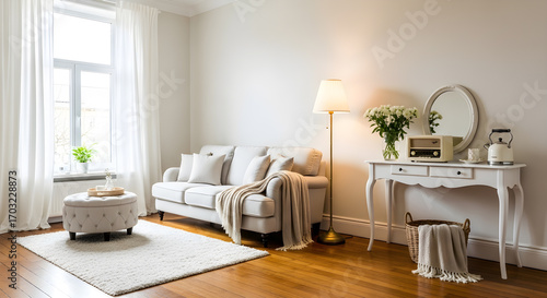 living, room, interior, design, decor, home, style, modern, elegant, cosy, furniture, sofa, couch, ottoman, rug, carpet, floor, wood, window, curtain, light, bright, airy, roomy, vanity, table, mirror, radio, vintage, lamp, lighting, plant, flower, bouquet, basket, blanket, throw, pillow, cushion, neutral, colours, white, cream, beige, minimalist, clean, simple, inviting, comfortable