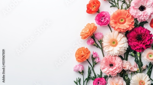 bright, inviting, banner, flower, shop, bold, bouquet, gerbera, carnation, ranunculus, high-coloured, shades, pink, orange, crisp, white, background, design, composition, clarity, sharpened, elegance, aesthetic, arrangement, colours, freshness, presentation, attracted, beauty, nature, florals, contrast, detail, harmony, sophistication, floral, blossom, flower petals, bloom, attraction, atmosphere, creativity, warmth, liveliness, brightness, excitement, energy, charme