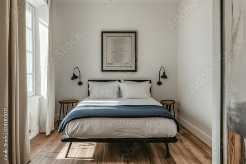 bedchamber, bed, white, wood, frame, artwork, light, window, curtain, simple, minimalist, modern, clean, pillow, blanket, blue, sheet, lamp, wall, floor, ceiling, design, interior, space, bright, serene, cosy, comfortable, elegant, style, natural, sunlight, structure, furniture, room, home, decor, neutral, detail, texture, pattern, small, calm, shade, view
