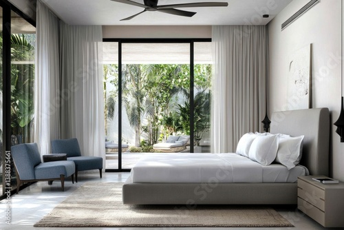 bedchamber, interior, modern, design, light, space, window, view, bed, pillow, white, fabric, furniture, chair, seating, decor, style, comfortable, relaxing, luxury, natural, elegant, simple, clean, airy, curtain, sheer, floor, carpet, rug, nightstand, artwork, ceiling, fan, black, frame, plant, green, leaf, outside, patio, open space, palm tree, calm, minimalist