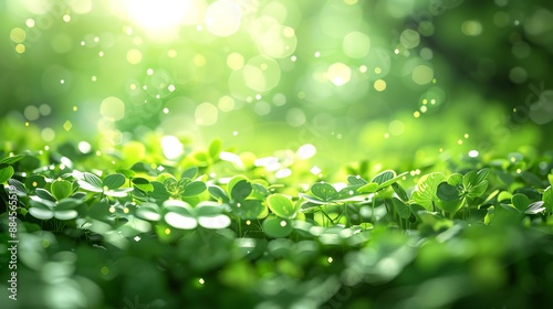 A bright field of clovers illuminated by serene sunlight and surrounded by bokeh lights, presenting a calm and refreshing natural landscape perfect for tranquil themes.