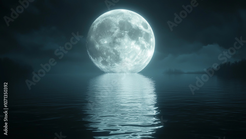 A bright full moon illuminates a tranquil lake surrounded by serene clouds at night, reflecting beautifully on the water's surface