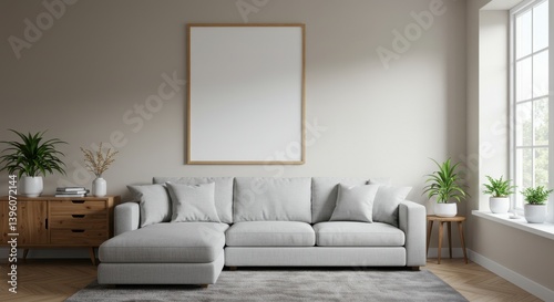 A bright living room featuring a gray sectional sofa with a blank canvas hanging above it on the wall