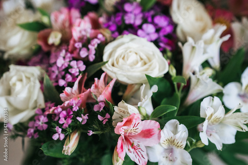 A bright, luxurious bouquet of colorful alstromeria and white roses. Photo with blurred background.
