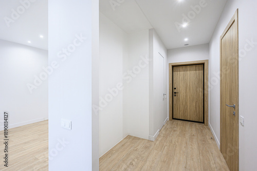 hallway, minimalist, modern, design, flooring, wood, light, wall, white, ceiling, light, door, wooden, handle, metallic, interior, space, layout, trim, edge, detail, craftsmanship, simplicity, elegance, texture, finish, surface, paint, smooth, contemporary, style, utility, neutral, tone, residential, decor, cabinetry, panel, alignment, symmetry, fixture, hardware, installation, room, entrance, corridor, sleek