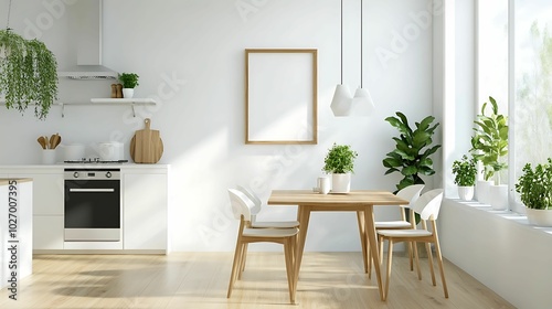 A bright, minimalist kitchen and dining space featuring white walls, wooden furniture, and indoor plants, with ample natural light streaming through large windows.