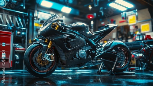 A bright modern motorcycle is displayed in the garage, highlighting its elegant design and intricate futuristic details