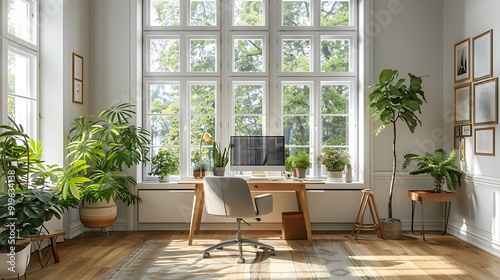 scandinavian, office, light, wood, floor, white, wall, minimalist, furniture, modern, desk, ergonomic, chair, simple, decor, large, window, natural, green, plant, fresh, experiencing, hd, quality, look, ar, v, 250, style, raw