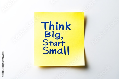 A bright, vibrant yellow sticky note displays the motivational phrase 'Think Big, Start Small', promoting strategic planning and actionable goals for success.