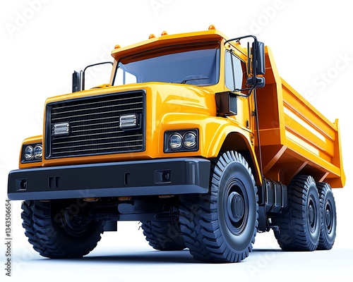 vehicle, truck, heavy, duty, construction, transport, equipment, industrial, machinery, engineering, dump, yellow, large, wheel, tire, front, side, perspective, view, engine, cab, bed, cargo, load, design, illustration, isolated, white, background, detail, power, strength, rugged, transportation, utility, automotive, commercial, chassis, bumper, grille, light, window, exterior, drive, motion, steel, metal, structure