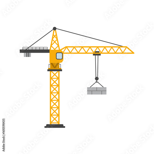 crane, construction, building, heavy equipment, machinery, industrial, industry, lifting, vector, illustration, icon, isolated, white background, engineering, development, architecture, urban, site, job site, project, work, block, material, load, cargo, hook, boom, jib, yellow, grey, simple, clean, graphic, symbol, concept, progress, growth, structure, infrastructure, real estate, property, highrise, skyscraper, modern, technology, transport, logistic