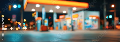 A brightly lit gas station at night with a convenience store and blurred city lights in the background.