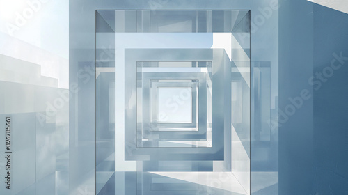 A broken mirror reflecting wholeness in the center of a maze of transparent walls, with a light blue sky