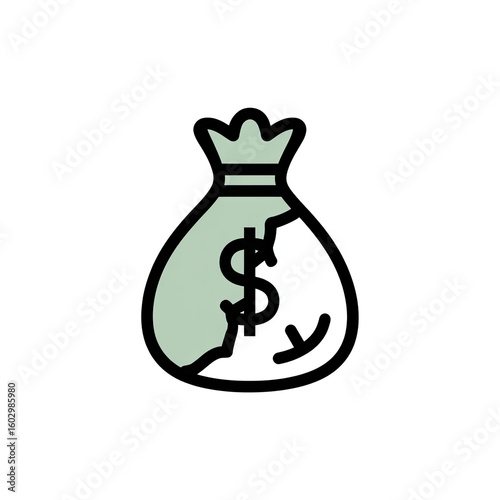 money, bag, broken, cracked, dollar, symbol, icon, graphic, illustration, simple, design, light, green, white, black, background, finance, wealth, economy, currency, cash, investment, savings, budget, spending, income, profit, loss, distressed, fragile, vulnerable, damaged, torn, ripped, cleaving, business, commerce, empty, concept, vector, art, minimalist, flat, outline