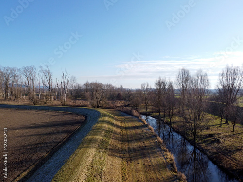 A brook river stream in Bavaria, aerial view photographed with a drone in winter