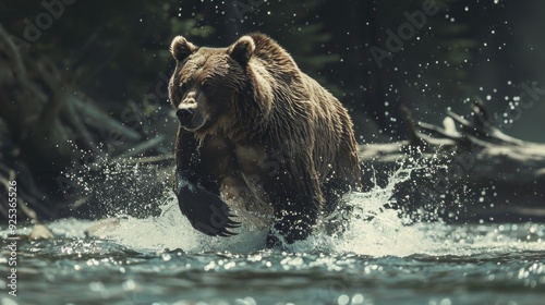 A brown bear vigorously dashes through a river, captured mid-splash, embodying the raw, dynamic power of wildlife in its natural environment.