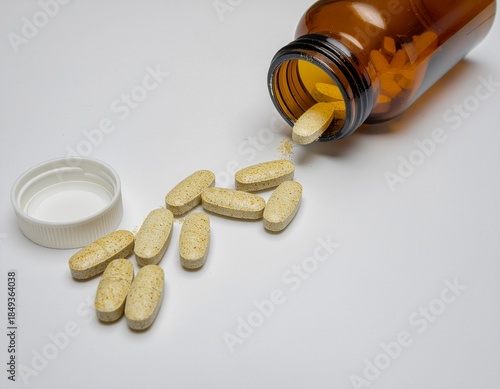 pill, bottle, medicine, health, supplement, vitamin, capsule, pharmacy, drug, treatment, care, wellness, medicals, health care, container, spill, out, white, surface, background, studio, shot, isolated, object, tablet, dosage, prescription, remedy, therapy, healing, nourishment, dietary, organic, natural, chemical, compound, substance, element, ingredient, formulation, preparation, mixture, powder, granule, tablet, oval, shape, colours, light