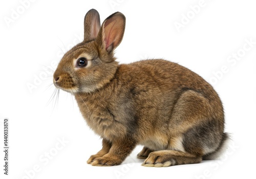 A brown rabbit sitting on a white background in a studio with its ears perked up looking ahead