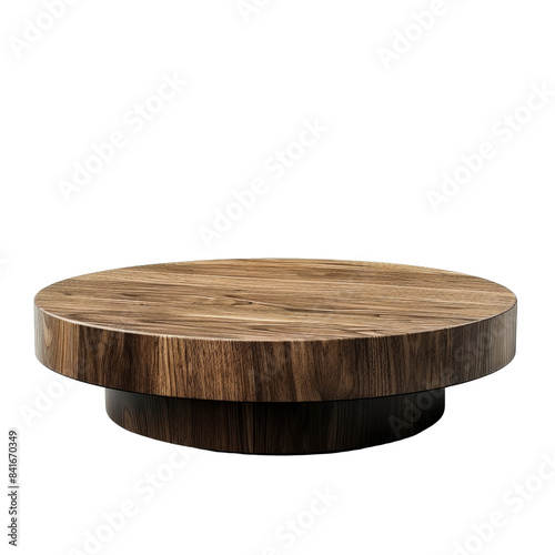 A brown rectangular wooden cutting board sits on a light colored wooden table, isolated on white background