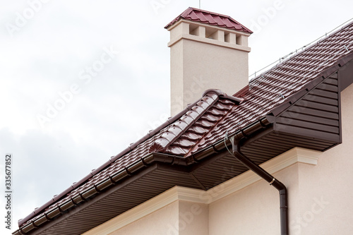 a brown rooftop of a ceramic tile with a pipe a storm drainage system and vent pipe, close up details of the architectural structure of a house.