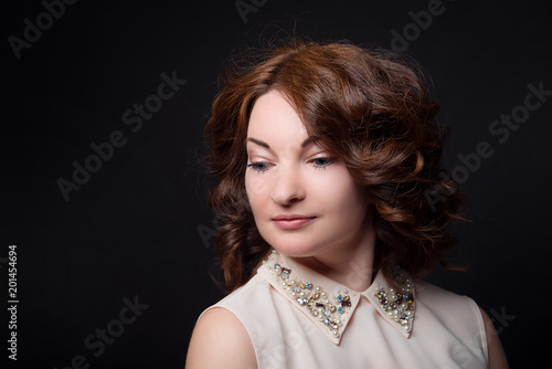 A brunette girl with a hairdo and makeup looks down on a black isolated background close-up.