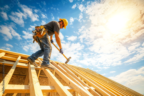 construction, roof, carpenter, men at work, wood, tool, hammer, nail, labourer, hard hat, building, house, structure, truss, sunlight, sky, craftsman, site, roofing, timber, work, design, industry, sharpened, workplace, carpenter's shop, frame, attic, builder, construction site, workbench, craftsmanship, house-building, framework, labor, construction worker, housing, civil engineering, scene, building site