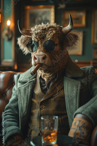 A bull in a stylish jacket and glasses smokes a cigar in a bar