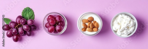 A bunch of grapes, a bowl of grapes, a bowl of almonds in milk, and a bowl of cottage cheese on a pink background.