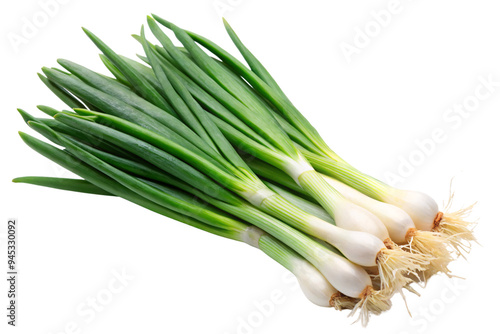 A bunch of green onions, neatly arranged. The white bulbs and green stalks are prominently displayed, offering a fresh, healthy look against the transparent background