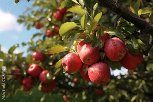 A bunch of red apples hanging from a tree. Perfect for food, harvest, or nature-related projects