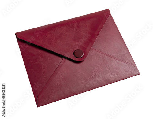 A burgundy leather envelope with a button closure, set against a stark black background