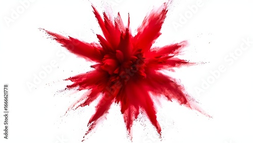 A burst of bright red Holi powder frozen in motion, creating a vivid and energetic display on a pure white background.