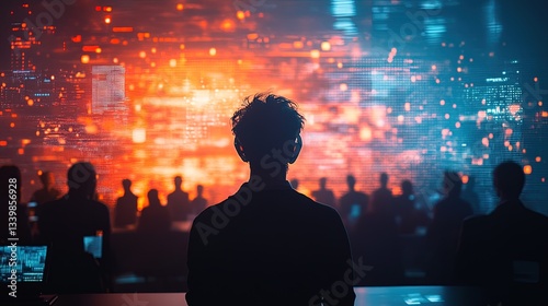A business conference featuring holographic networking tools and interactive displays, vibrant and cutting-edge