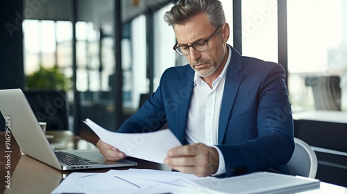 A business man in a suit sitting at his desk and reading documents while using a laptop computer in an office background with glass windows.