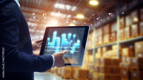 A business professional holding a tablet with a graphical interface, standing in a large warehouse filled with boxes, symbolizing data management and logistics operations.