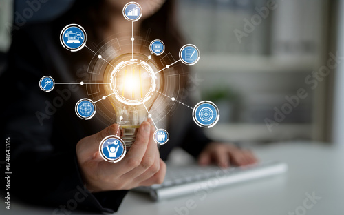 A business professional holds a glowing light bulb symbolizing innovation, surrounded by virtual icons. This image captures the essence of creativity and technology in a modern workspace. Crux