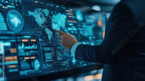 A business professional interacts with a digital map interface, showcasing data analytics and global insights in a modern, high-tech environment.