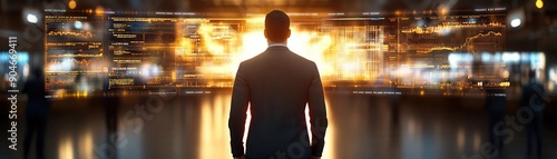 A business professional stands before a digital display, symbolizing innovation and the future of technology.