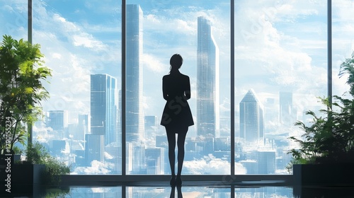 A business woman standing in her modern office, gazing at the sleek glass towers in the cityscape