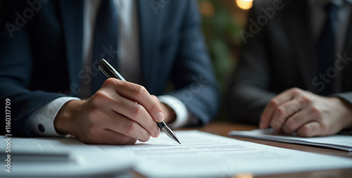 a businessman engaged in signing a contract or agreement, likely a crucial moment in a recruitment or business deal