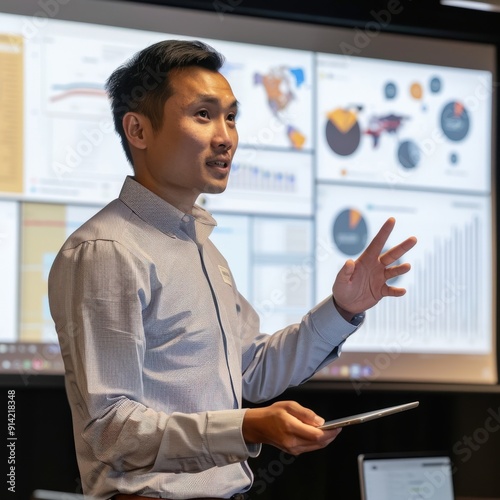 businessman, presentation, front, large, screen, display, chart, graph, gesture, hand, figure, interaction, entrepreneur, event, cognition, communication, report, information, progress, motivation, workshop, mentor, projection, seminar, public, education, visual, showcase, success, illustration, power, corporate, explanation, analytic, boardroom, statistic, projector, guidance, executive, professional, leadership, annual, lecture, performance, confidence, whiteboard, profit