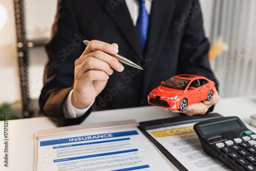 A businessman in a formal suit explains car insurance details, holding a small red car model and pointing at contract documents, symbolizing agreement, protection, and financial planning.