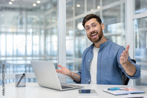 A businessman in a modern office, smiling and gesturing while using a laptop at his desk.