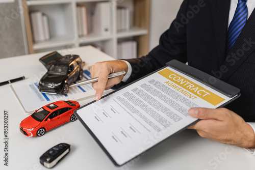 A businessman in a suit is presenting car insurance and contract documents with miniature car models on the desk, symbolizing vehicle insurance, financial planning, and legal agreements.
