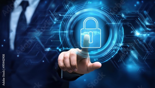 A businessman interacts with a digital lock interface, symbolizing cybersecurity and data protection in a modern tech environment.
