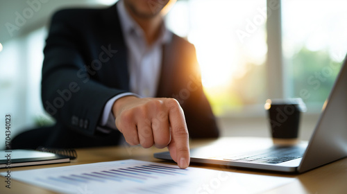 A businessman points to a KPI icon on a laptop surrounded by performance graphs his desk with a notepad and a coffee cup sunlight streaming in KPI evaluation business