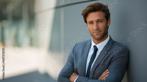 businessman, confident, professional, male, business attire, corporate, sunny, natural light, copy space, smiling, success, modern, urban, executive, self-assured, daytime, entrepreneur, charisma, nature, blue skies, attractive, warm light, lifestyle, motivation, inspiration, achievement, contemporary, objective, branding, marketing