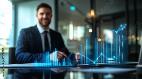 A businessman presenting a 3D bar chart in a modern office, with data bars floating above the table, emphasizing growth and success in business performance